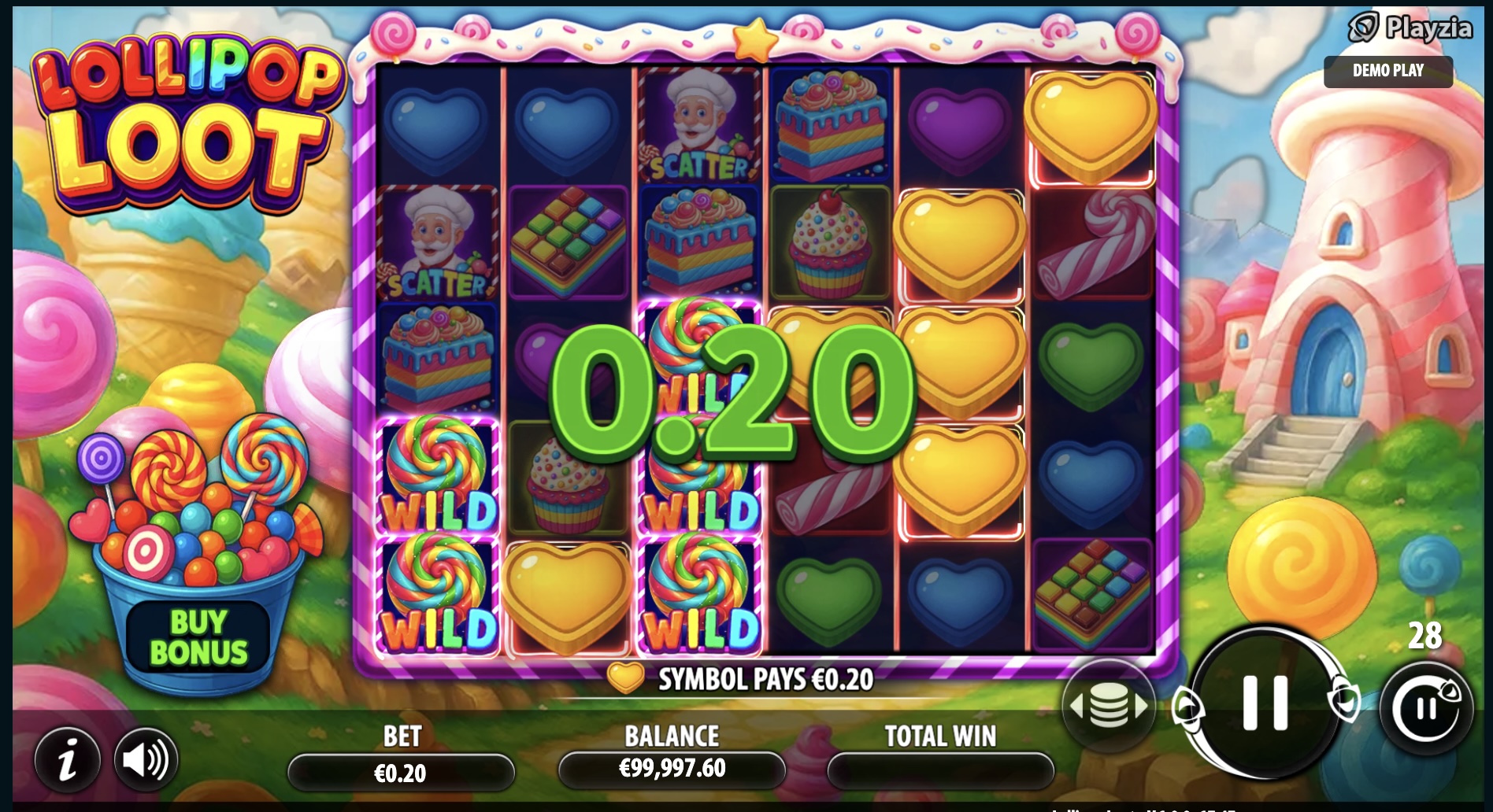 In a clear departure from classic slots, Lollipop Loot Playzia slot does not feature traditional paylines, which tell you how to win. Instead, you must land at least 10 of a specific symbol to win, while 20+ of one symbol would bring the biggest payout. For instance, 10 hearts only pays 1x, but 20+ hearts pays 50x.