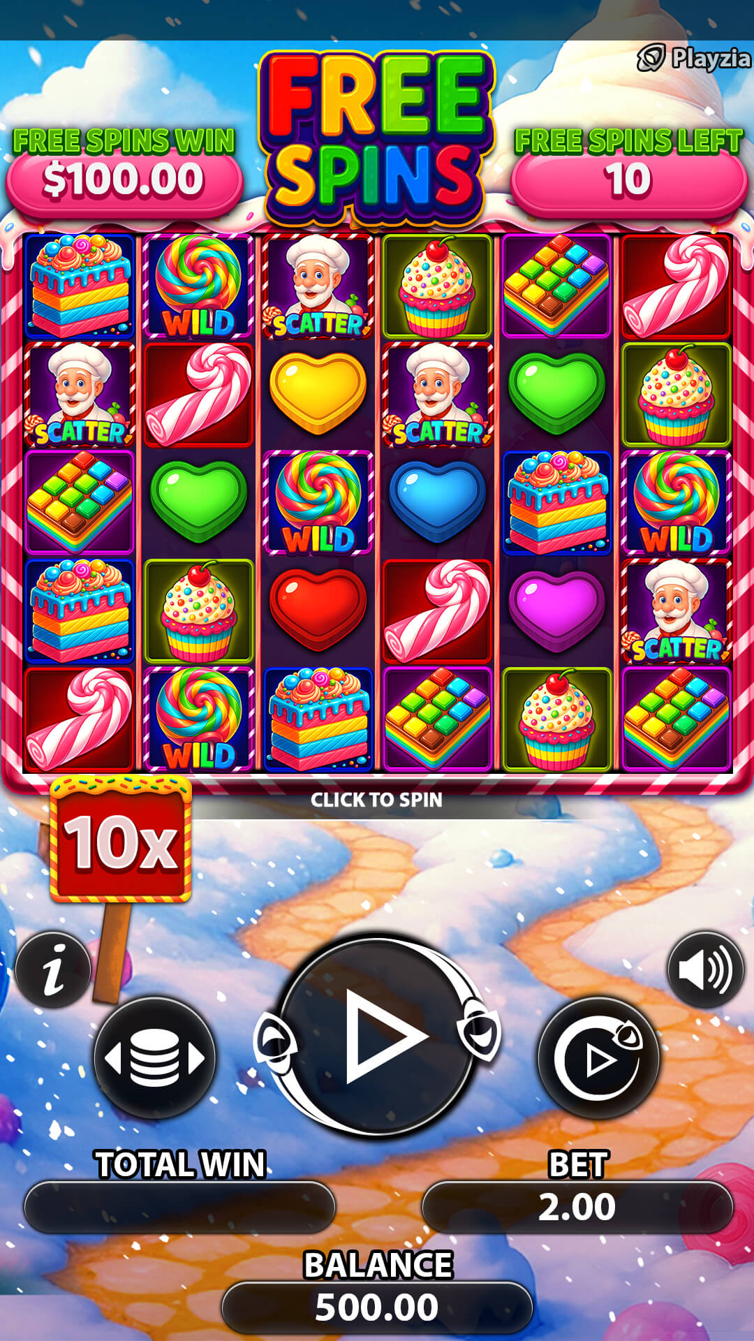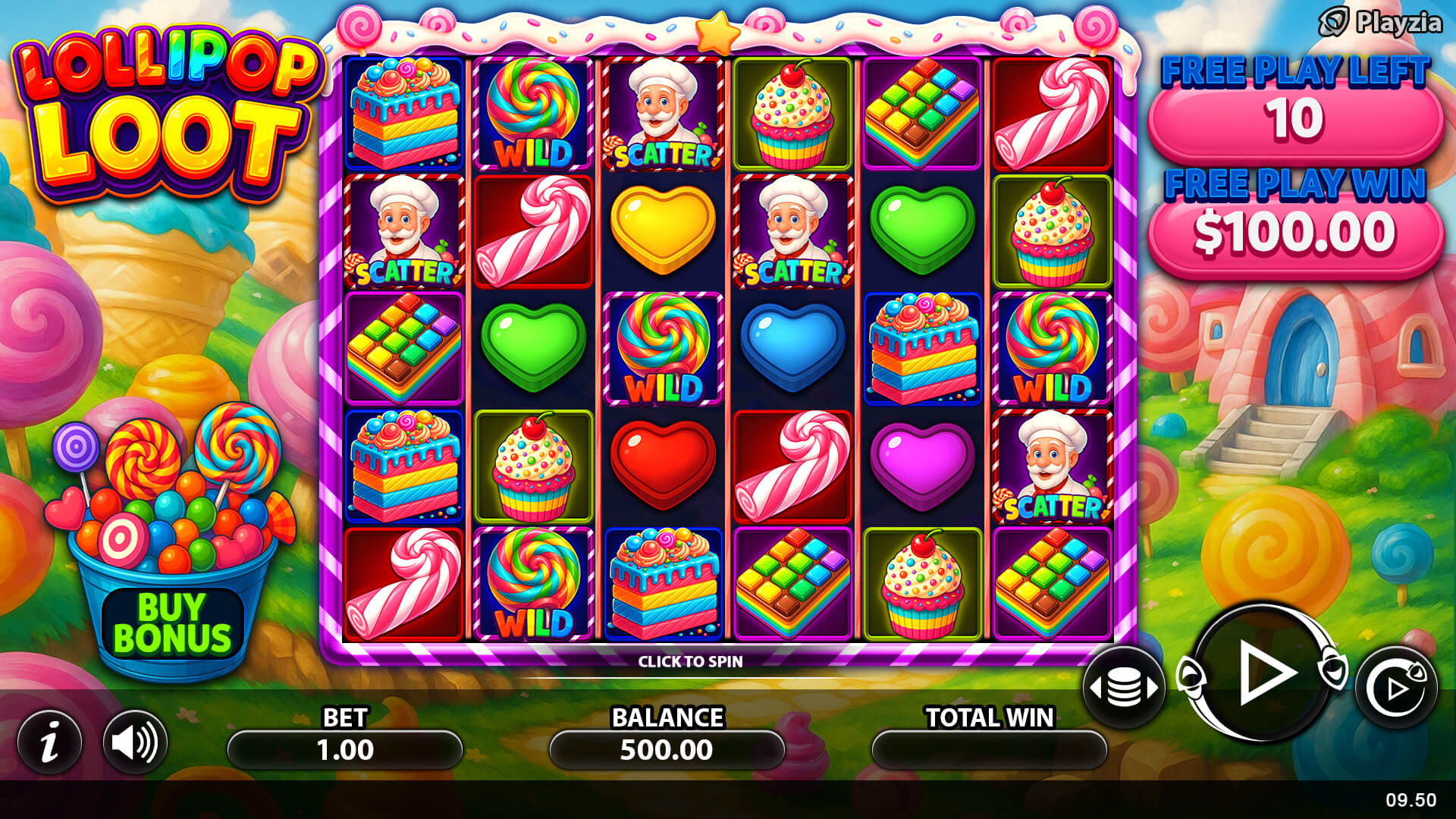 Here at Playzia, we host a diverse range of slot themes. Lollipop Loot at Playzia is really one of a kind, it’s a candy- themed slot featuring graphics full of vibrant pinks and purples. The eye-popping graphics also bring surprises like playful pastry chef scatters alongside your usual hearts and candy symbols. As well as the visual pop, an upbeat candy shop soundtrack music adds to your fun experience.